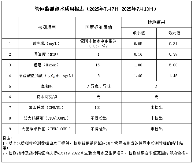 管網監測點水質周報表(2025年7月7日-2025年7月13日)