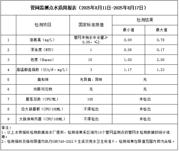 管網(wǎng)監(jiān)測點水質(zhì)周報表(2025年8月11日-2025年8月17日)