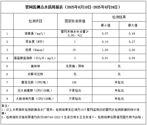 管網監測點水質周報表(2025年8月18日-2025年8月24日)
