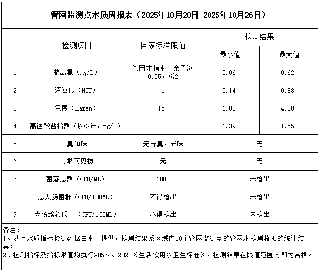 管網監測點水質周報表(2025年10月20日-2025年10月26日)