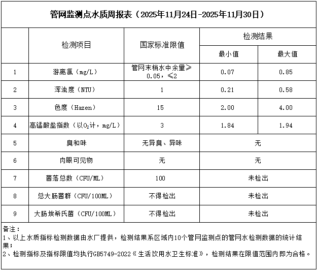 管網監測點水質周報表(2025年11月24日-2025年11月30日)