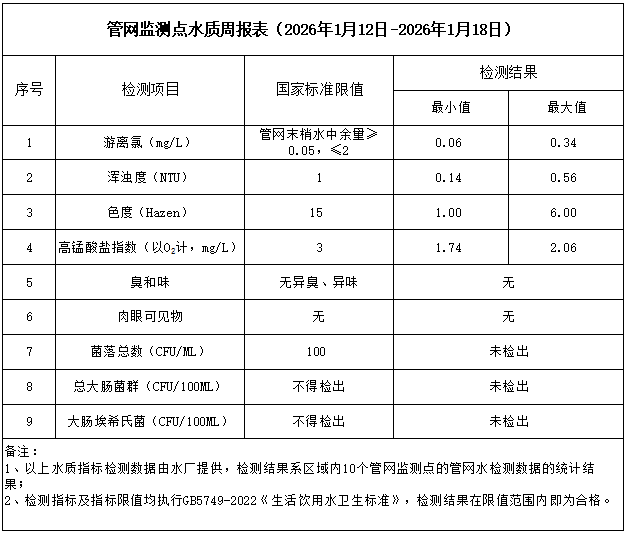 管網監測點水質周報表(2026年1月12日-2026年1月18日)