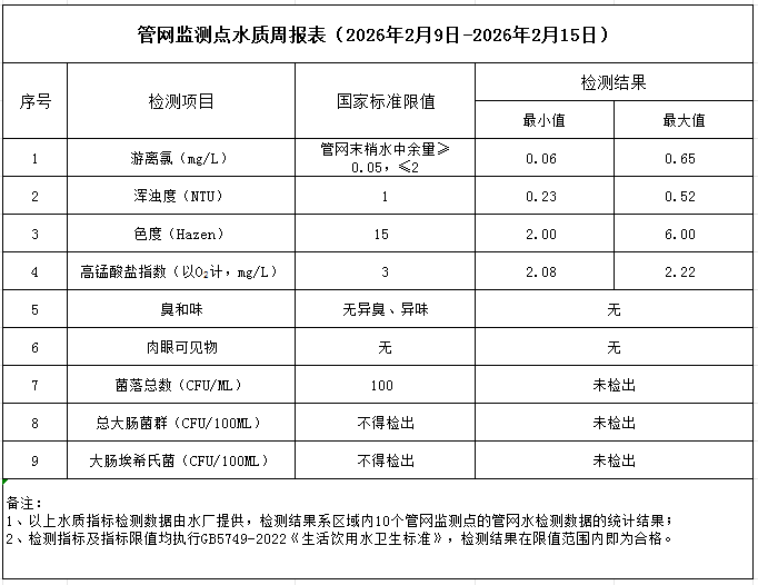 管網(wǎng)監(jiān)測點(diǎn)水質(zhì)周報(bào)表(2026年2月9日-2026年2月15日)