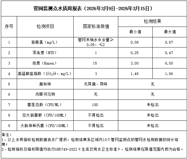 管網監測點水質周報表(2026年3月9日-2026年3月15日)