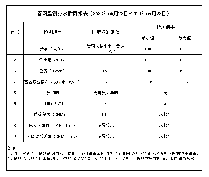 管網(wǎng)監(jiān)測點(diǎn)水質(zhì)周報(bào)表(2023年05月22日-2023年05月28日)