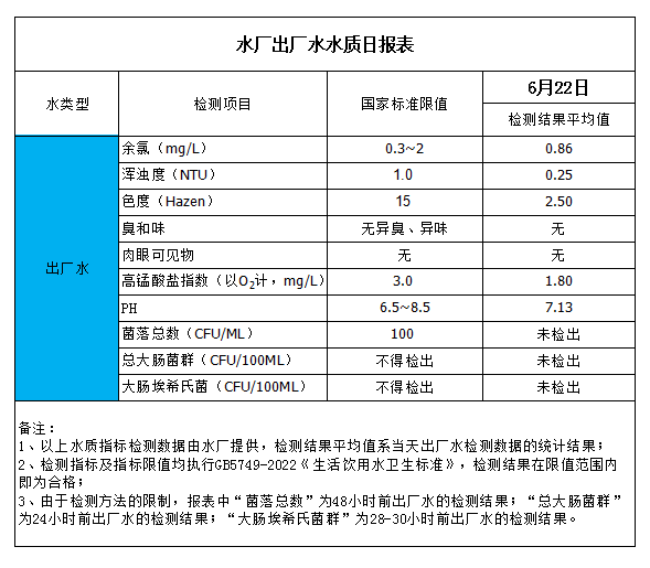 水廠出廠水水質(zhì)日報(bào)表(2023-6-22)