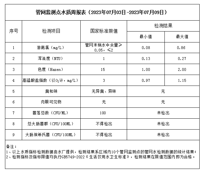 管網監測點水質周報表(2023年07月03日-2023年07月09日)